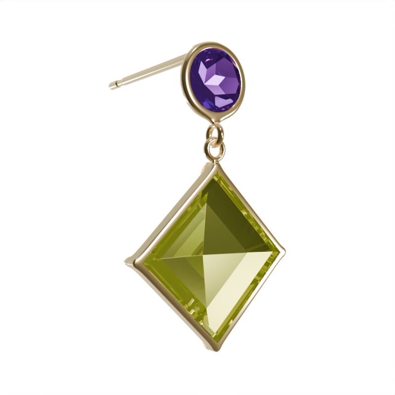 Peridot (August / Leo) has Marital Love, Good Fortune, Hope. The vibrant green pop blends with purple Amethyst for a fresh, uplifting vibe.